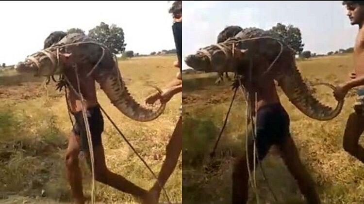 मगरमच्छ को कंधे पर लादकर ले जाता युवक