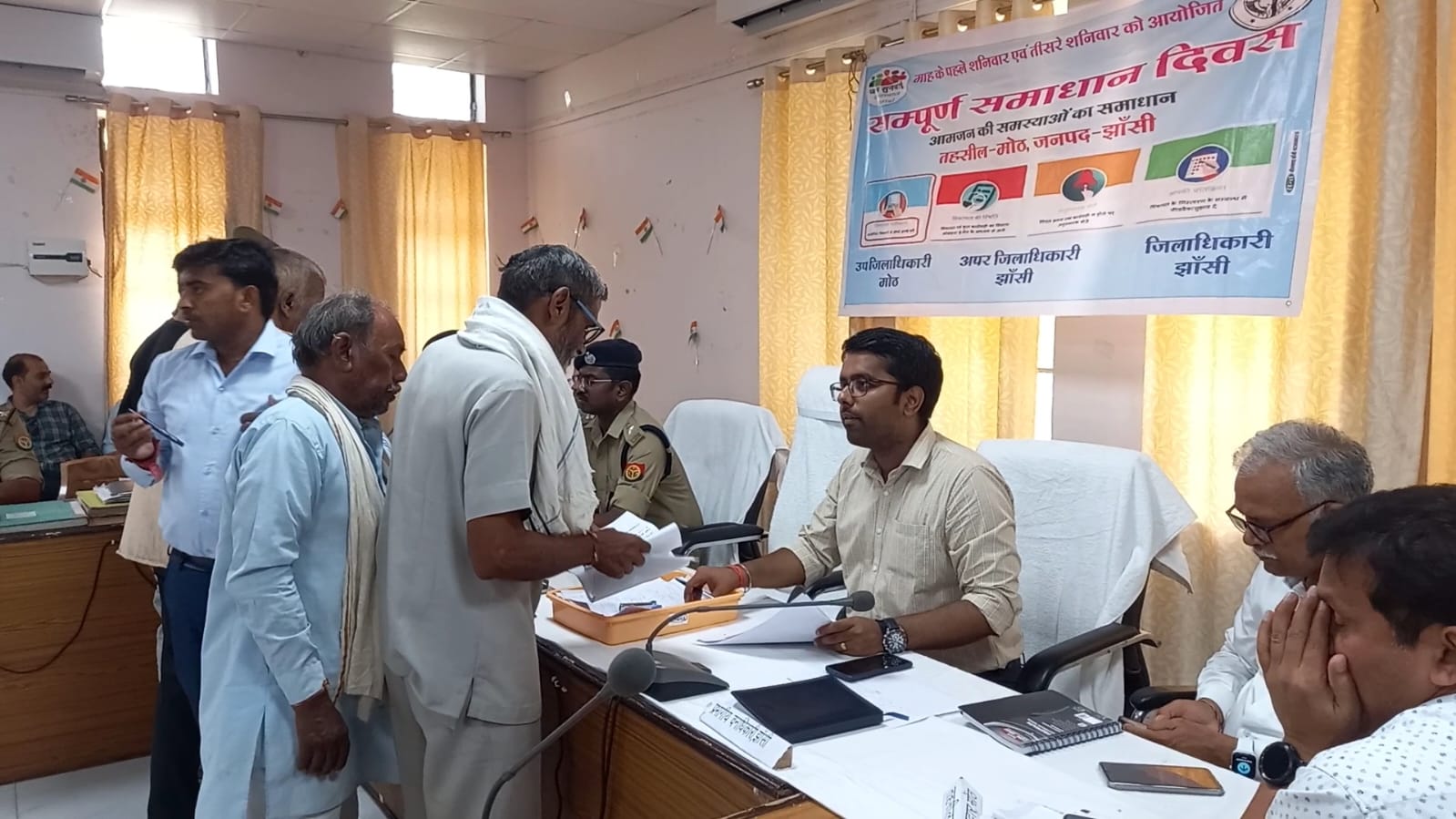 मोठ (झांसी) तहसील मोठ में झांसी एसएसपी राजेश एस की अध्यक्षता में संपूर्ण समाधान दिवस का आयोजन किया गया। जिसमें तहसील क्षेत्र से आए फरियादियों ने अपनी अपनी फरियाद अधिकारियों को सौंपी, जिसमें पुलिस एवं राजस्व के संयुक्त मामले 16, पुलिस विभाग के 28, राजस्व विभाग के 65, विकास विभाग के 28, नगरपालिका के 08, सिंचाई विभाग के 04, पूर्ति व अन्य विभाग के 26 प्रार्थना पत्र आए थे, जिनमें 05 प्रार्थना पत्रों का मौके पर निस्तारण किया गया। जबकि 169 शिकायती पत्रों का जल्द से जल्द निस्तारण कराने हेतु आला अधिकारी ने संबंधित विभागों को निर्देशित किया है। राजेश कुमार का संपूर्ण समाधान दिवस के मौके पर उप जिलाधिकारी क्षितिज द्विवेदी, पुलिस क्षेत्राधिकारी लक्ष्मीकांत गौतम, तहसीलदार प्रभात सिंह समेत संबंधित सभी विभागों के अधिकारी एवं कर्मचारी मौजूद रहे।