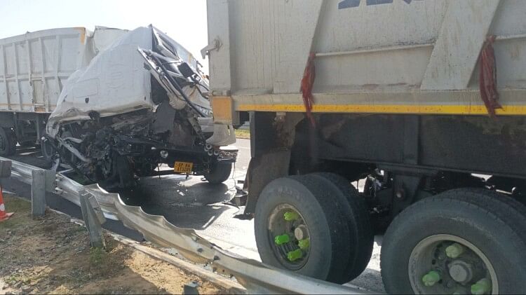 बुंदेलखंड एक्सप्रेस-वे पर हुई भिड़ंत में डंपर का अगला हिस्सा हुआ क्षतिग्रस्त