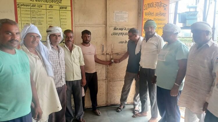 पिसावा के गांव पलसेड़ा में बिजली घर पर ताला लगाते किसान