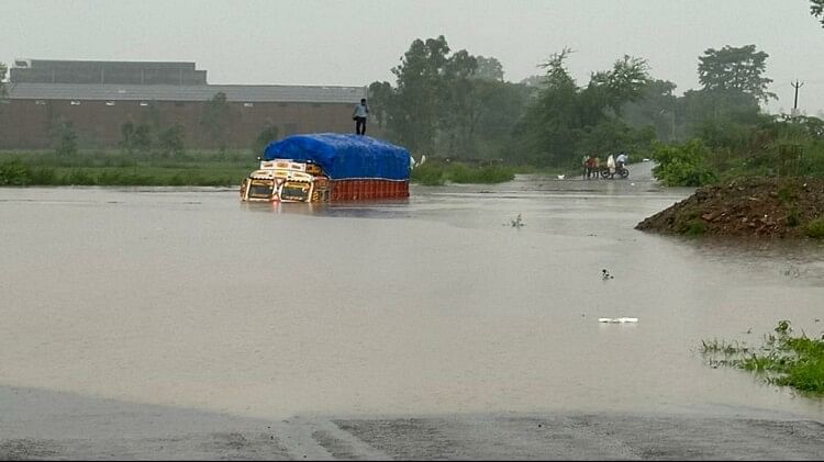 नदी में अचानक आया उफान, हाईवे पर पानी के बीच फंसा ट्रक