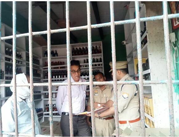 सिकंदराराऊ में शराब की दुकान का निरीक्षण करते एसडीएम वेद सिंह चौहान।